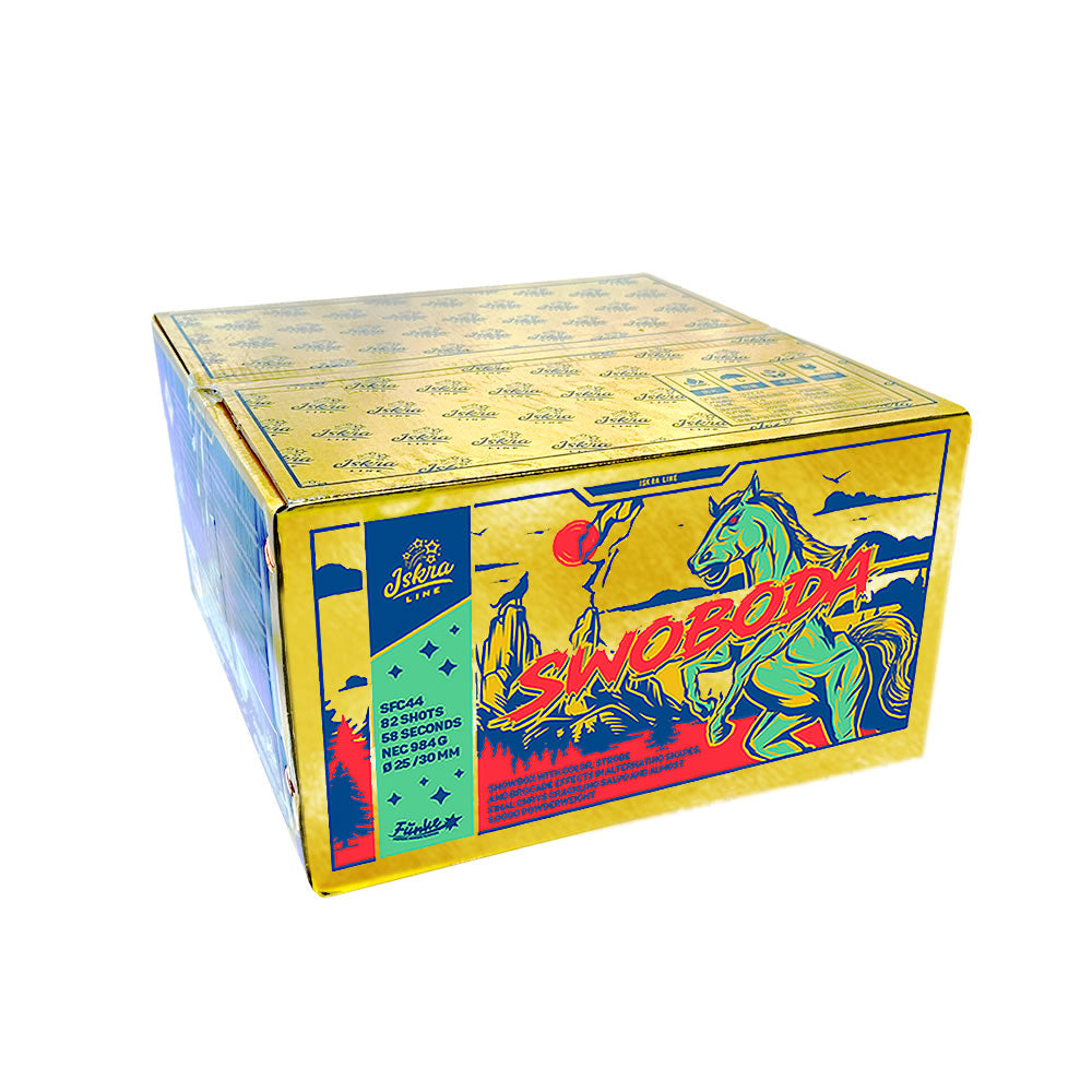 Showbox with color, strobe and brocade effects in alternating shapes, final chrys crackling salvo and almost 1.000g powderweight.