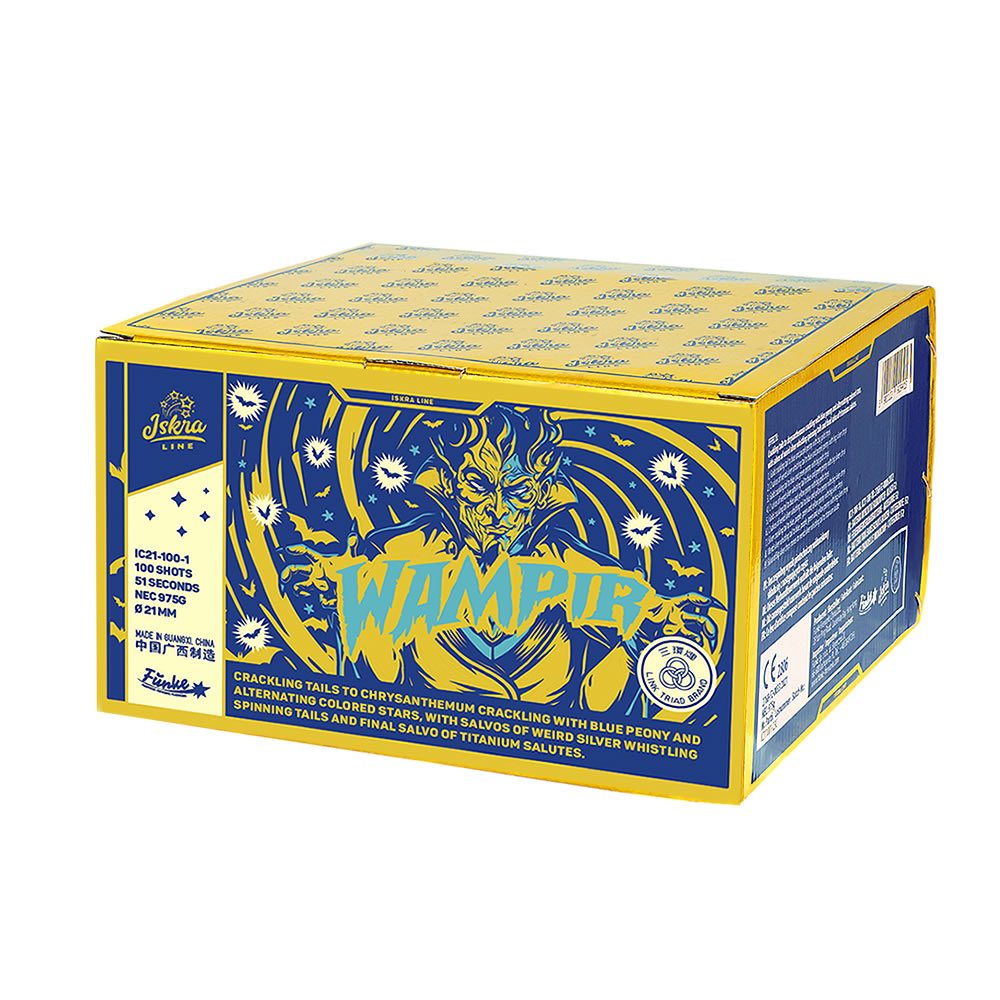 100 Schuss Verbund im Kaliber 21mm mit Crackerschweif-Aufstiegen zu Crackereffekten mit bunten Sternen; Mit Kreischwirbel-Salven und Abschlussalve aus Titansaluts.